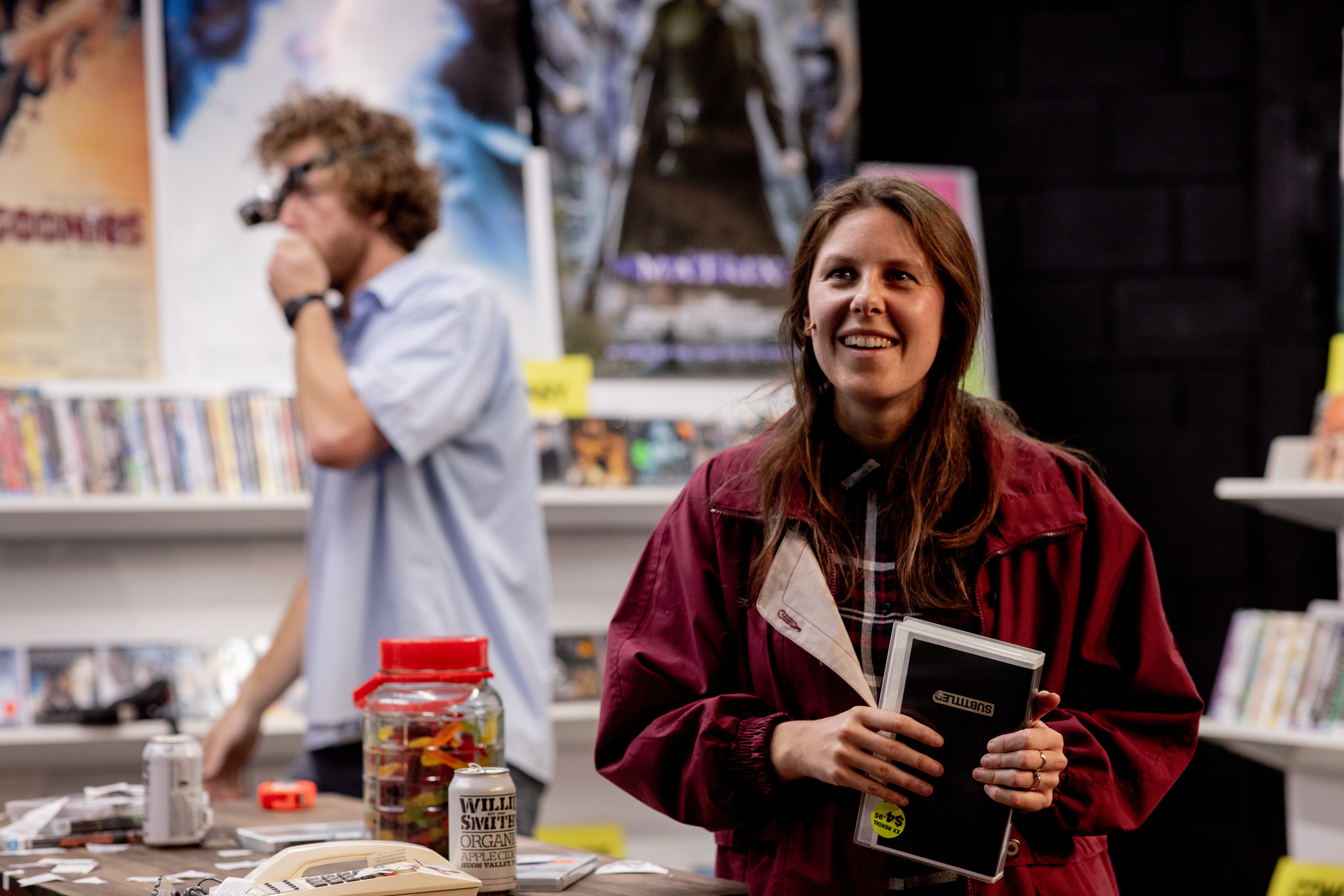 STEVE: There were a lot of things that ended up not being included in the show, we started with the video shop but as we were making it we, sort of, encountered all of these people that had similar ends like you know, as the video shop. And, when we bought our set – the set is a video shop and we’ve got 1200 DVDs, roughly, that we bought second-hand and we bought our shelves from a closing down bookstore in the CBD and that guy was going out of business because of COVID. He used to sell books to students, but because of COVID and the lack of international students he just went out of business. So, it felt like we were, sort of, telling his story as well when we incorporated the shelves into the sets. Our production manager for the show for that first one was Alistair Davies, who used to work at the university but also got made redundant at around that time. I also lost my job at around that time. So, there were a lot of different factors that were very relevant in the making of this show.