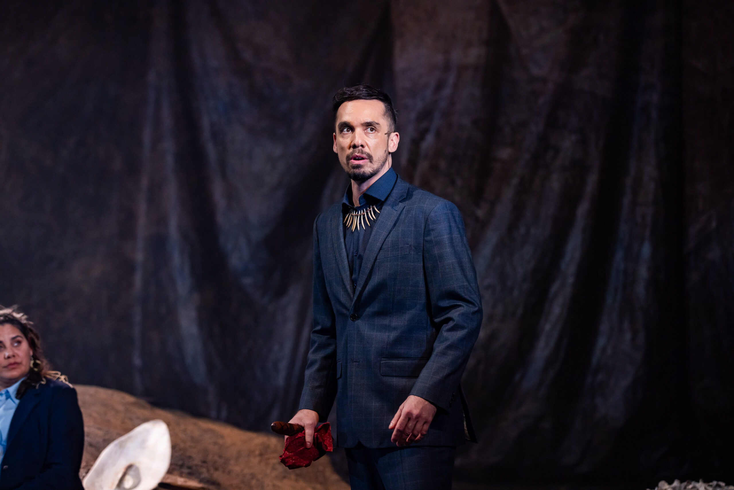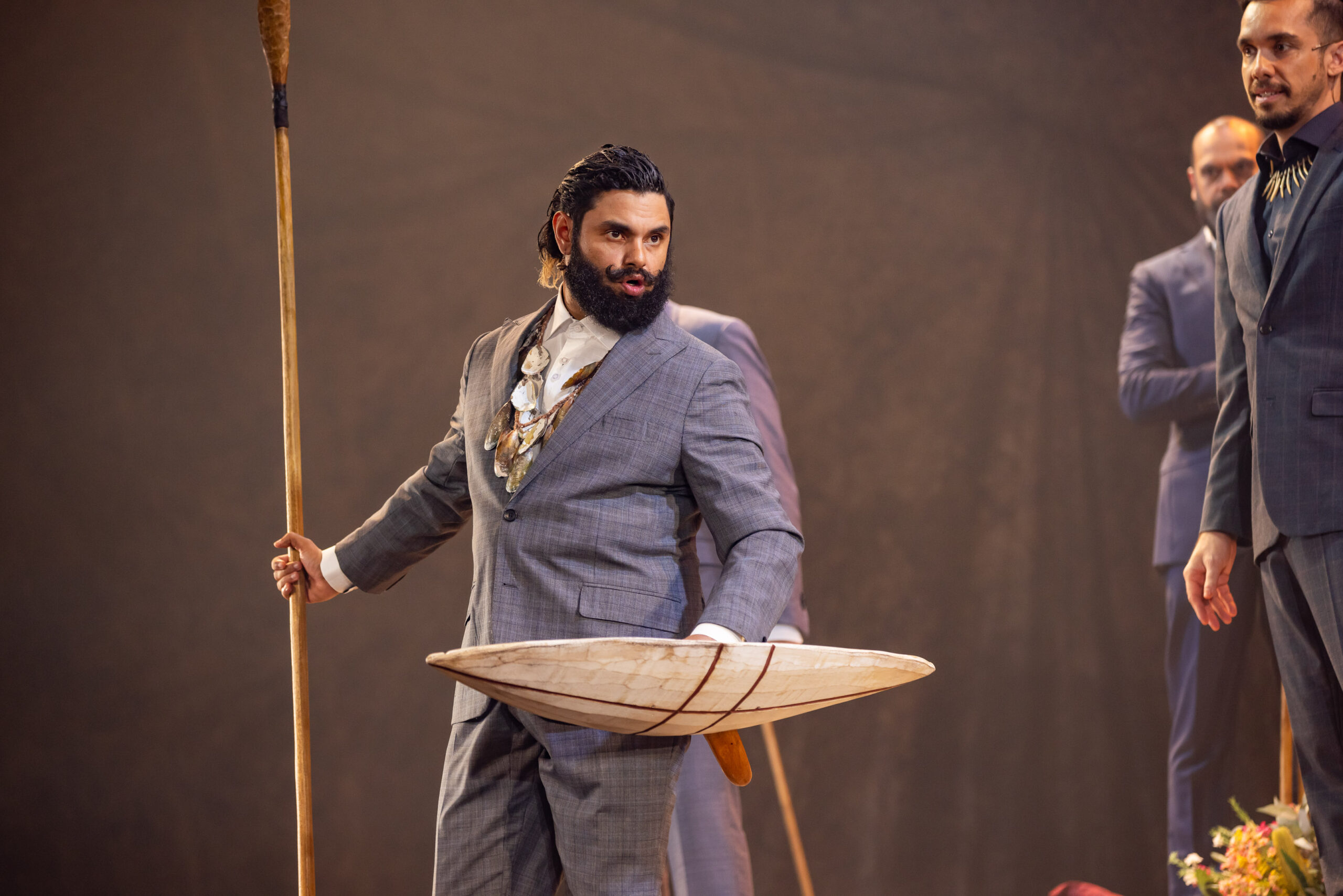 JANE: There’s actually a lot of humour in the show which often in first-nations storytelling people might be surprised about that. A play that’s really about colonisation that has humour in it. And, it’s also poignant – it makes you feel – you go on a journey with these characters as they talk and debate about their own connection to country and why these people won’t stay – because the lure of your own country is too great. They should be home looking after their own country so why would they stay? They’re sort of making decisions based on their own values and beliefs and ultimately decide that they will be gracious and magnanimous and welcome them to country. So, it’s quite moving at the end when they do that. So, it stands out to the audience.