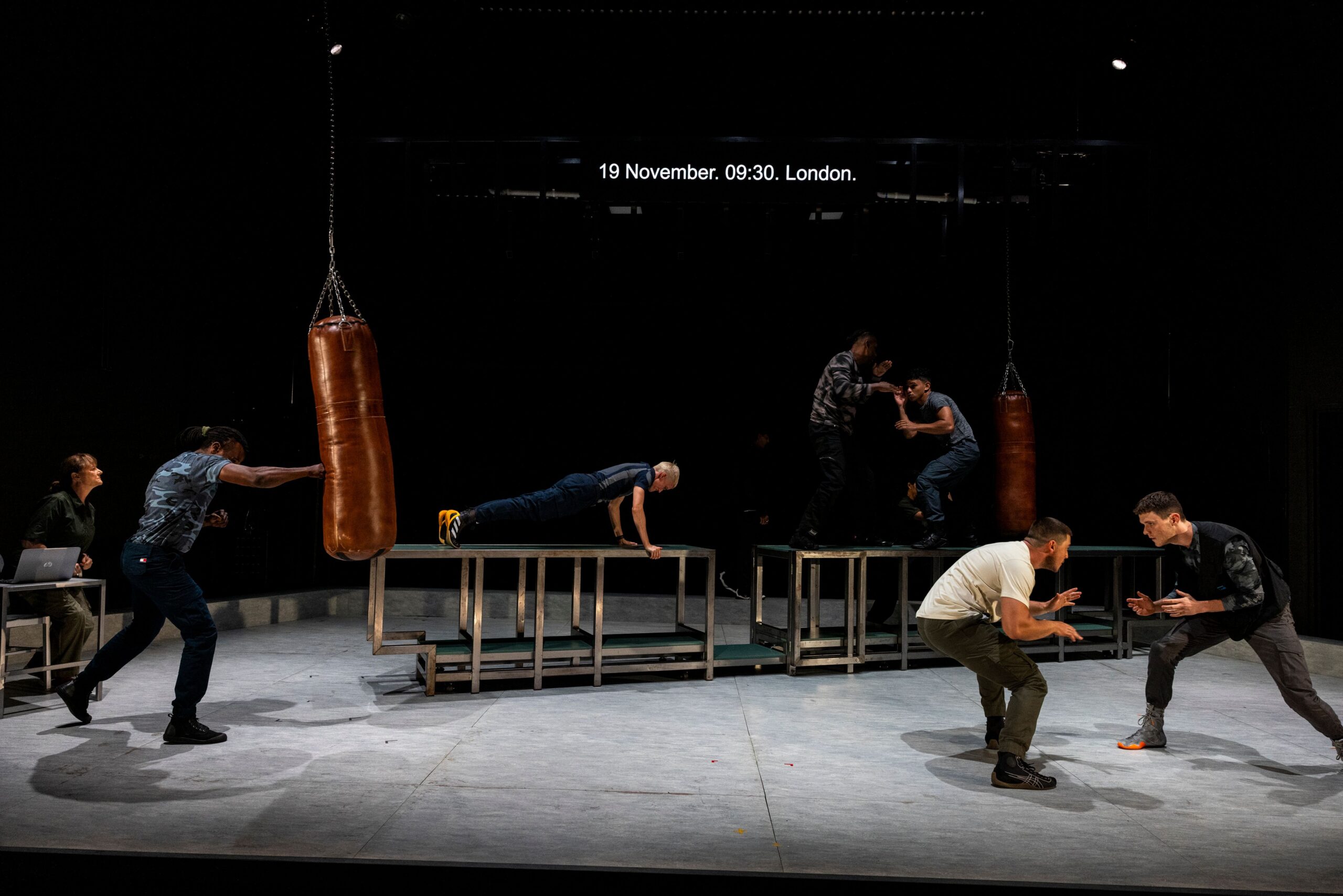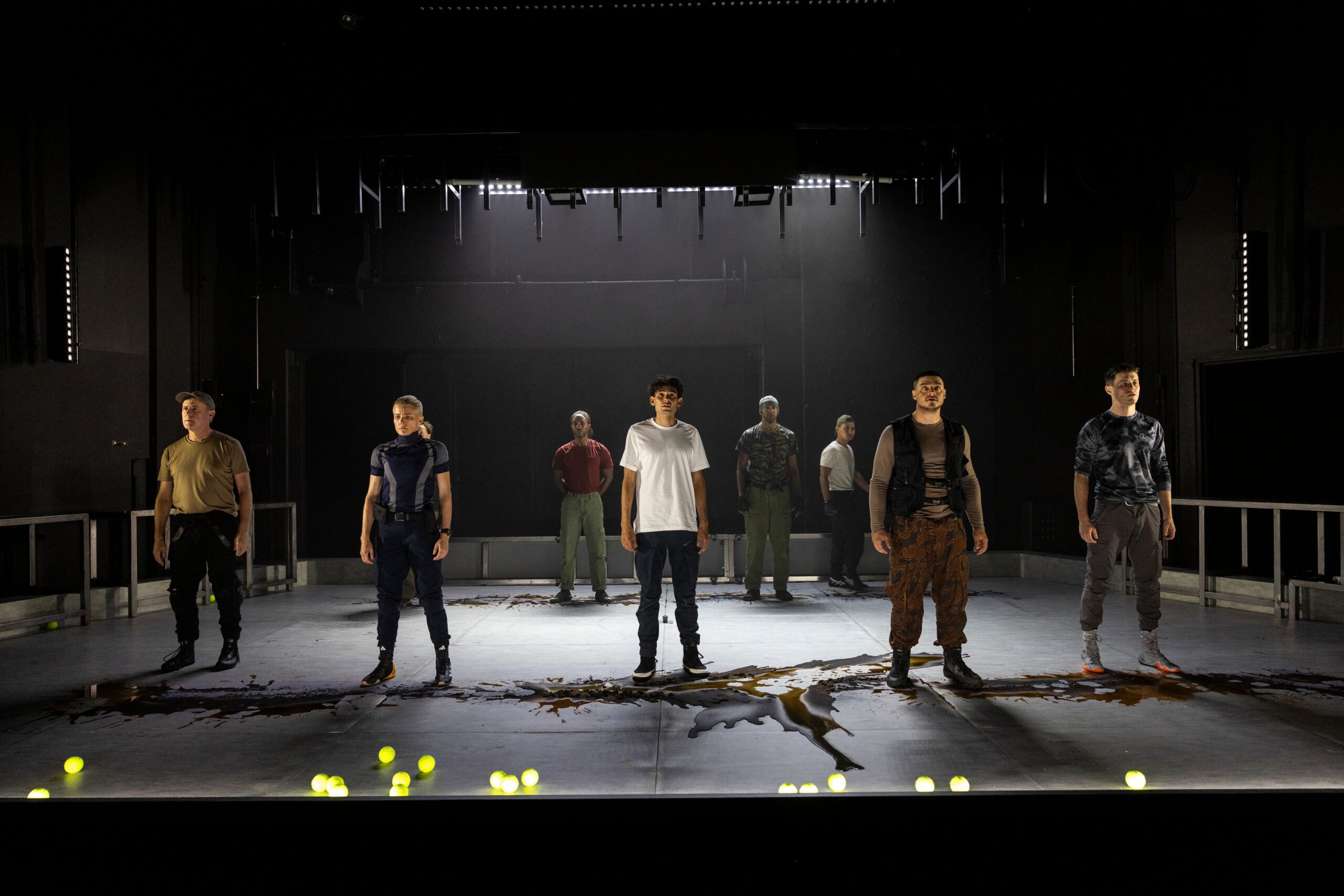 ELLA: Again, I feel very lucky to have been cast in this ensemble and I can’t really speak to anyone else’s masculinity, but for myself I really enjoy that the play and the physicality of the play allows me to be very grounded. It’s an athletic play, it’s a very moving piece and it requires a lot of physical skill amongst the whole cast. I reflect on it quite a lot on how beautiful it is, particularly for me as a non-binary body just to embrace those masculine elements, but as well just to feel at ease in my body. So, I’m not really attempting to play anything, I’m just allowed to be as I am … I don’t know how people perceive it, but for me it feels extremely comfortable and so I feel really grateful to be cast. You know, Exeter is written as a man, but I’m not trying to play gender, I’m just trying to play a kind of truth but I’m very grateful that the physicality is so connected, and so that is something I really enjoy.