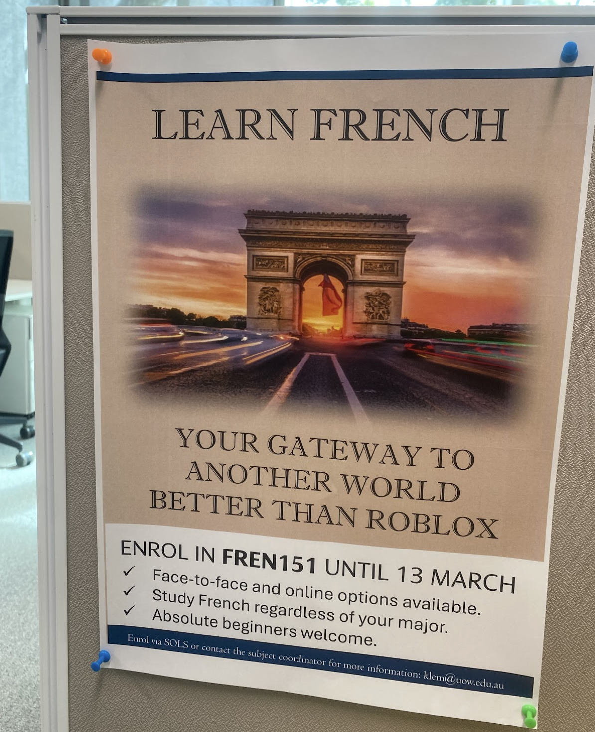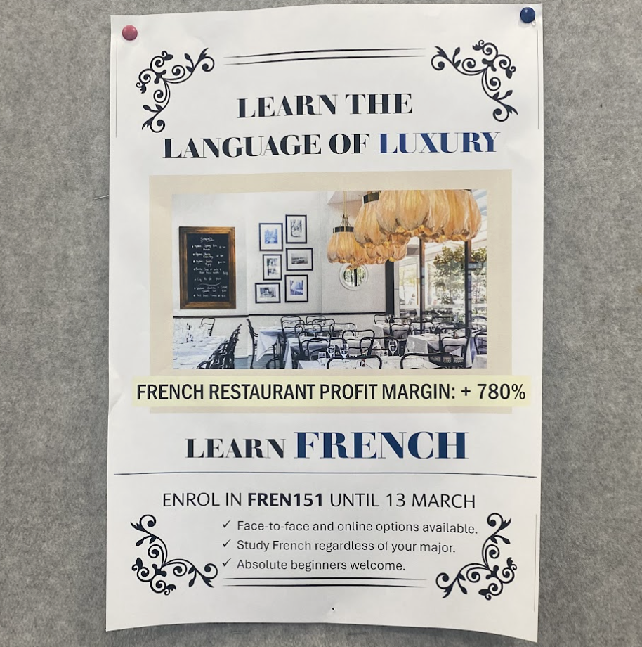 I hadn’t thought about these budget cuts since the new year started but since being on campus and seeing certain posters around, the cogs in my brain, rusted from the holiday break, began turning again. These posters featured images of cafes, the Eiffel Tower and the Arc de Triumph, with the headings like “LEARN THE LANGUAGE OF LUXURY” or “THE FRENCH EXCEPTION: 40% CHEAPER RENTS AND FREE UNIVERSITY EDUCATION” or “YOUR GATEWAY TO ANOTHER WORLD BETTER THAN ROBLOX.”