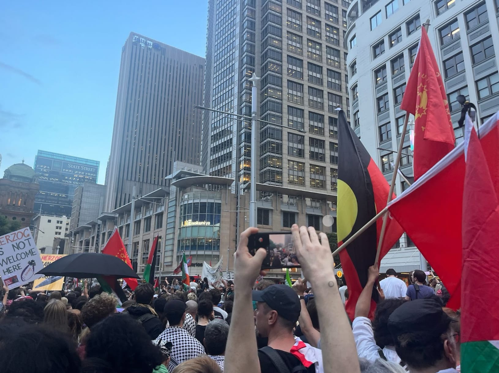 I messaged my friend who I was supposed to meet at the protest that I was in the crowd to the right of where the speakers were. It’s 5:40pm. The protest started only ten minutes ago. She told me she was a little late because she just finished work and she was being told by the police that she cannot enter Town Hall for the rally. The reason the police gave? The protest is at capacity. They directed her to Hyde park, feeding her misinformation on where the protest will move to. I looked beside and around me to see plenty of room for other protesters, I had been to rallies far more cramped. I messaged her that it’s total bullshit. Eventually, they let her in, but I could not find her amongst the crowd of thousands of people. I put my phone in my bag and listened to the speakers. One of the speakers spoke on seeing the massacre of her family unfold online. How she had to call hospitals in Gaza to check if her family was still alive. She speaks of seeing the mutilated bodies of loved ones on social media. Crying, I put my sunglasses on, out of habit. I am disgusted with Israel, with Herzog, and with my government’s complicity.