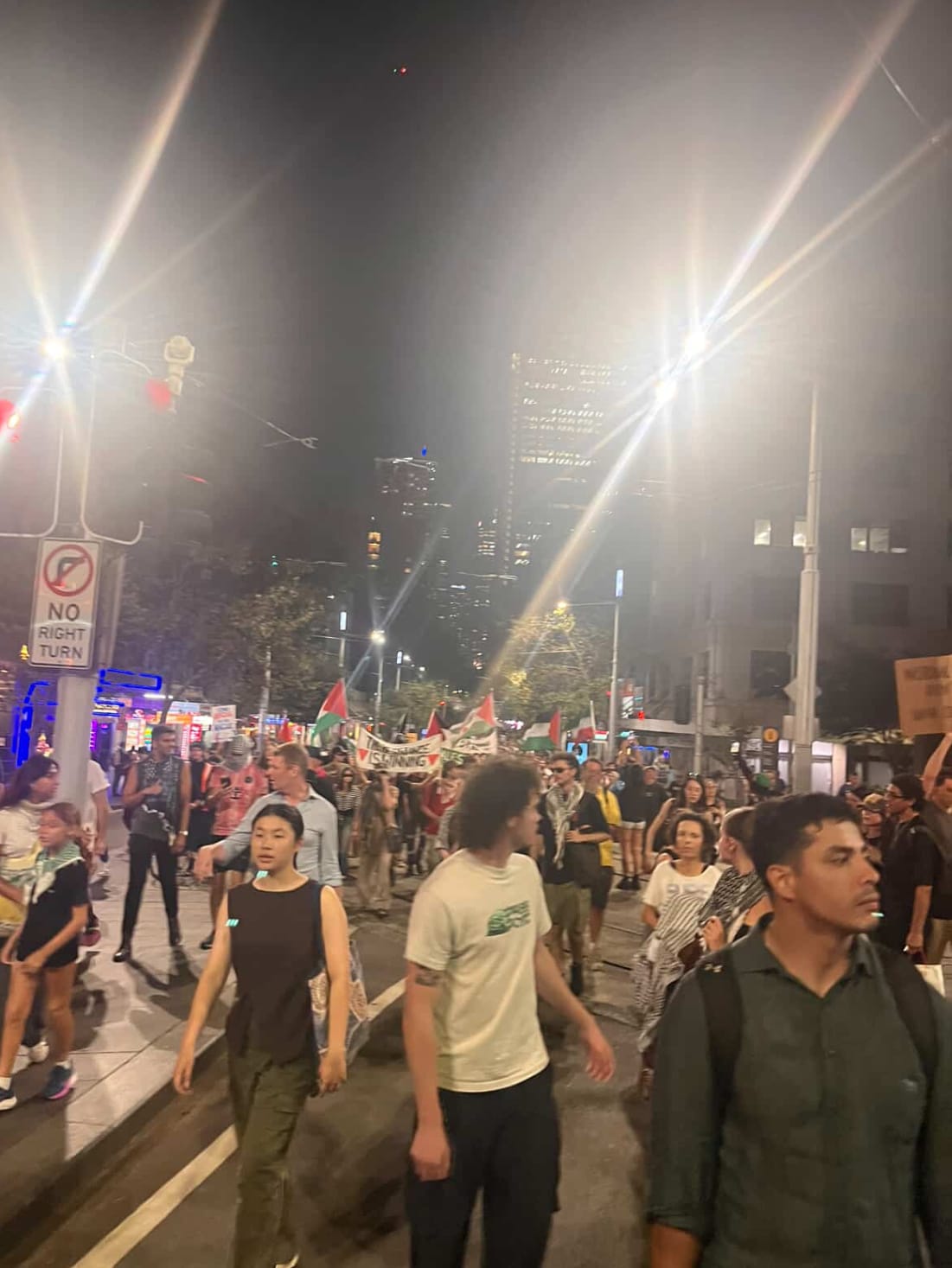 The voices are desperate. I saw a group of girls younger than me run past, crying, holding keffiyehs, and shirts, up to their eyes. The crowd was stagnant further in front, unable to move further due to the police blocking us, and protestors were running forward from behind us. We were packed tight. Protestors grabbed onto their friends as we moved forward in the increasingly pinched crowd. A woman came up to us, an organiser, or just as likely one of the many protestors trying to keep the collective safe. She told us not to turn around as the police are deploying pepper spray. Like an idiot, I glanced over my shoulder and saw that the police are now less than a metre behind us. Many on horses. I saw two protestors facing the police with arms around each other. The police officer in front of them lunged forward without provocation, another police officer holding him back. A family is confused, trying to get towards the train station to avoid the police violence. We guided them away from the police towards one of the staircases down to Town Hall station. The threat of pepper spray was still imminent, so we tried to ensure they didn’t walk across the police line for their safety.